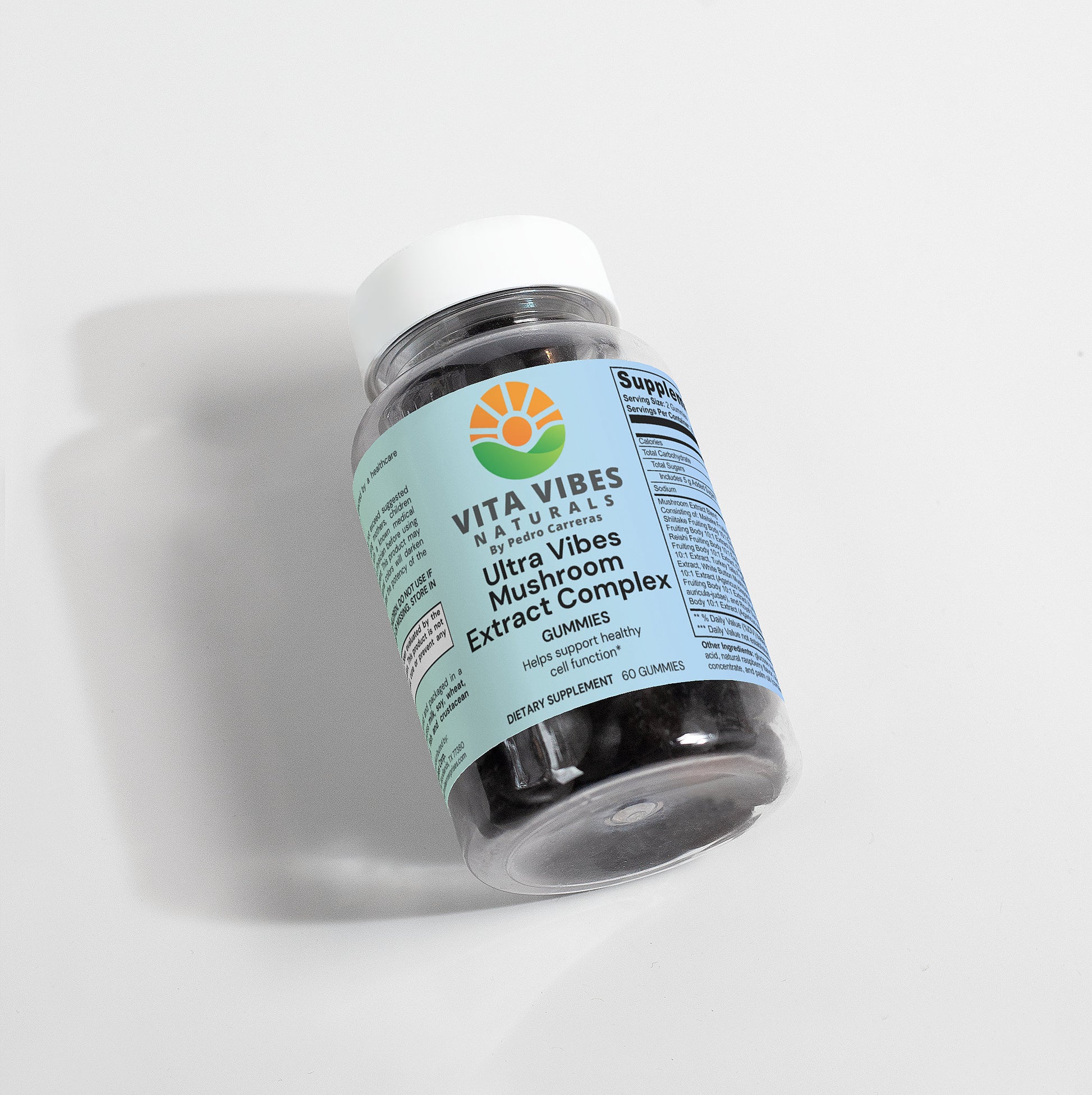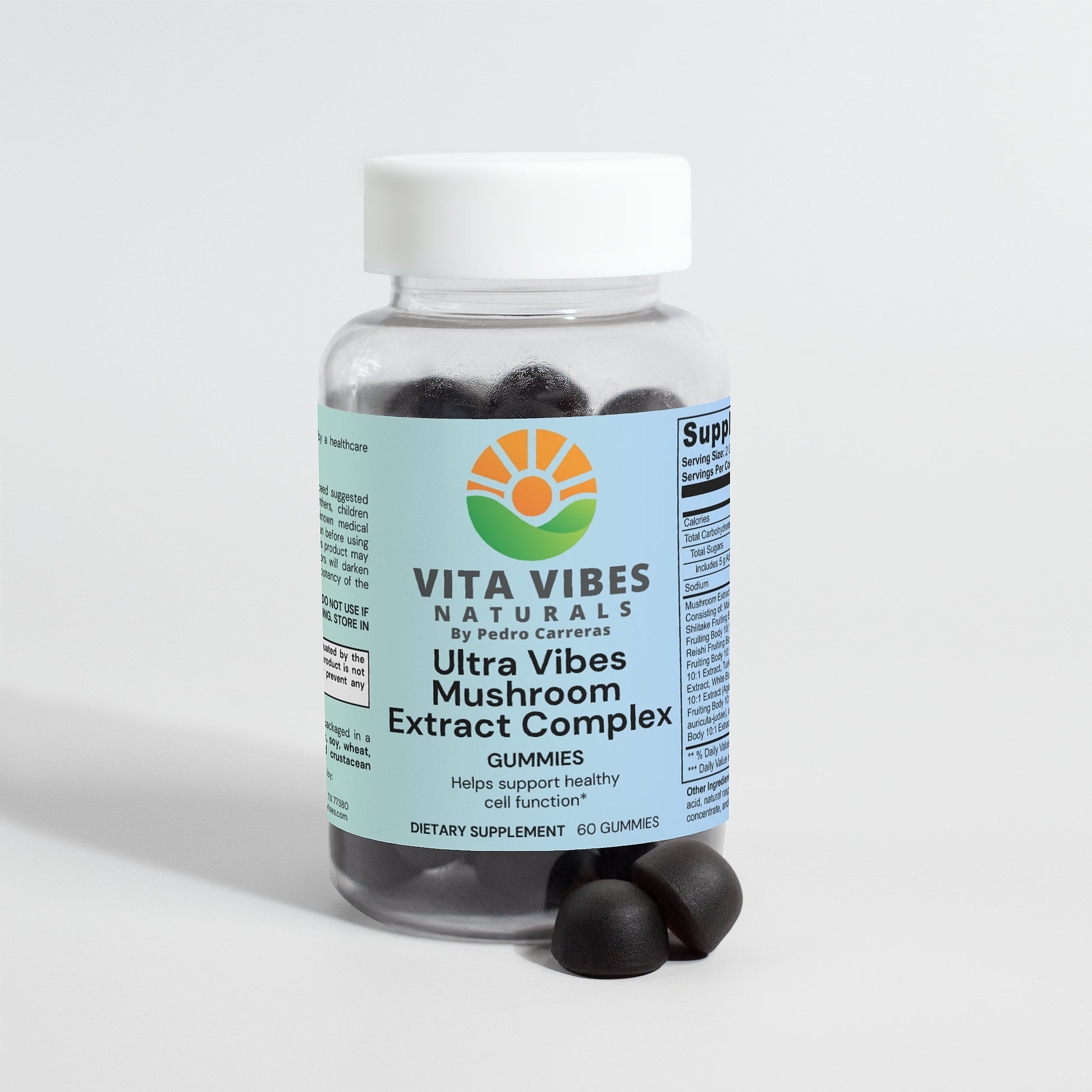 Nuestros Ultra Vibes Mushroom Extract Complex Gummies combinan los hongos más valorados del mundo: Maitake, Shiitake, Melena de León (Lion's Mane), Reishi, Cordyceps, Chaga, Cola de Pavo (Turkey Tail), Champiñón Blanco, Hongo Negro y Hongo Royal Sun.