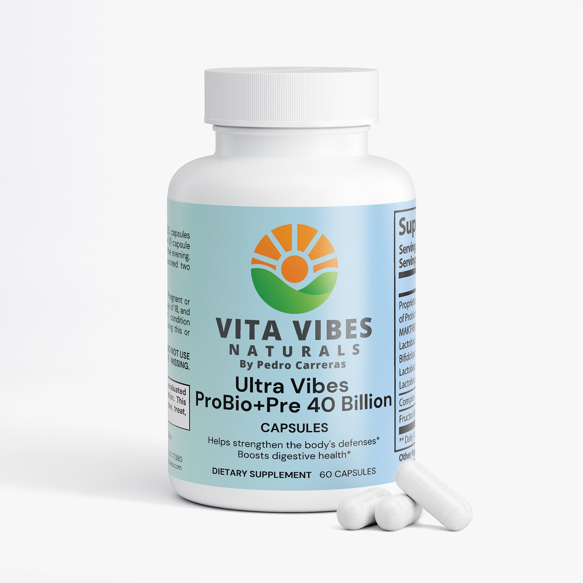 Ultra Vibes ProBio+Pre 40 Billion es una mezcla de cuatro cepas probióticas: Lactobacillus Acidophilus, Bifidobacterium Lactis, Lactobacillus Plantarum y Lactobacillus Paracasei.